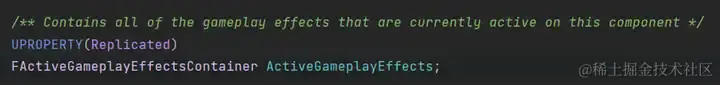 对GAS有一个基础的了解后,我们会知道,Effect本身并不会实例化,当ApplyEffect后,会生成一个实例,即FActiveGameplayEffect,它会储存在ASC的ActiveContainer中。游戏内所有的GE效果都会储存在这里,同时模拟端的GE也是通过它进行网络同步的(在默认模式下,只有主控端的ActiveEffect会同步)