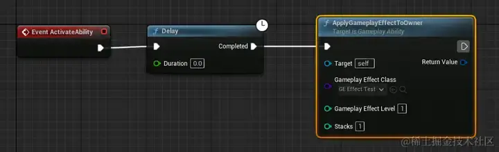 再进行一个小修改,技能延迟之后,我们延迟一帧再ApplyEffect,此时GE_Test是否会被添加到玩家客户端呢?