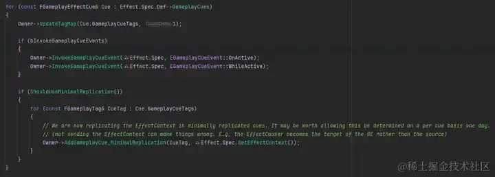 最后一个GE的效果是触发Gameplay Cue,逻辑大致为,遍历配置需要触发的GameplayCues,然后修改角色的Tags,让其添加对应的Cue Tag,然后调用InvokeGameplayCueEvent 让Cue在本地生效,最后让Cue通过同步在模拟端生效。