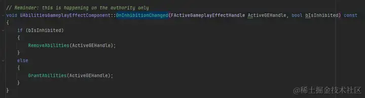 然后在 OnInhibitionChanged 中,调用其它程序小伙伴给我们提供的接口,去开启和关闭变身。参考AbilityEffectComponent,则是添加和移除Ability。