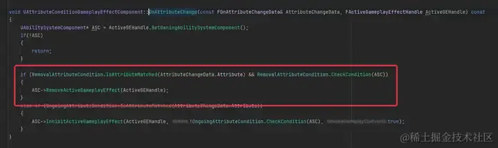 然后实现函数OnAttributeChange,它的作用是判断监听的属性变化后,是否满足了移除条件,如果满足则移除此ActiveEffect