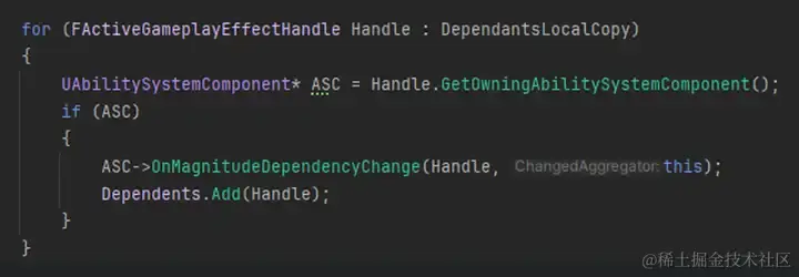 核心代码就比较简单了,循环所有依赖的于此属性的ActiveEffect,然后通过函数OnMagnitudeDependencyChange 更新属性。大致的方式就是遍历改Effect全部的Modifiers,然后根据依赖属性新的值重新计算出新的ModInfos,先移除老的ModInfos,再把更新后的Add到所修改属性的Aggregator中去。