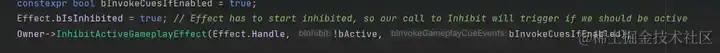 需要注意的是,这里的Inhibit指的是让GE激活和关闭效果,并不会将GE移除,和Add和Remove的概念是不一样的。可以理解为GE首先生成ActiveEffect实例,被添加Add到ActiveEffectContainer中,然后通过激活(!Inhibit)GE产生实际的效果,包括添加tag,修改属性等。