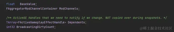 我们来看看Aggregator中,是如何实现的。可以看到FAggregator中,ModChannels即上面提到的ChannelContainer,用于计算实际属性值,这里的Depedents就代表了依赖于此属性的Active Effects,以上面的例子来说,生命值属性的的Aggrator中,依赖于生命值的GE就包括了狂暴buff。