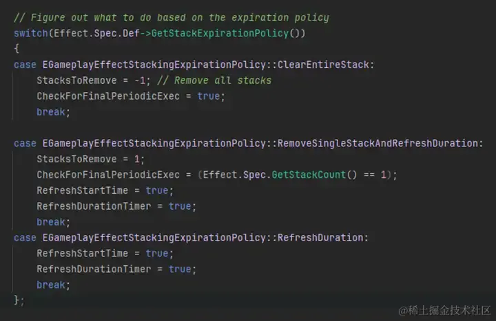 当Stack Effect持续时间到后触发,FActiveGameplayEffectsContainer::CheckDuration