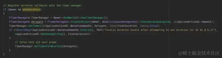 注册Timer,这里会在堆叠GE首次创建,或者刷新时调用,时长为GE的持续时间。当然这里设置的是GE的持续时间,是针对所有的Duration Effect,而不仅仅是Stack Effect