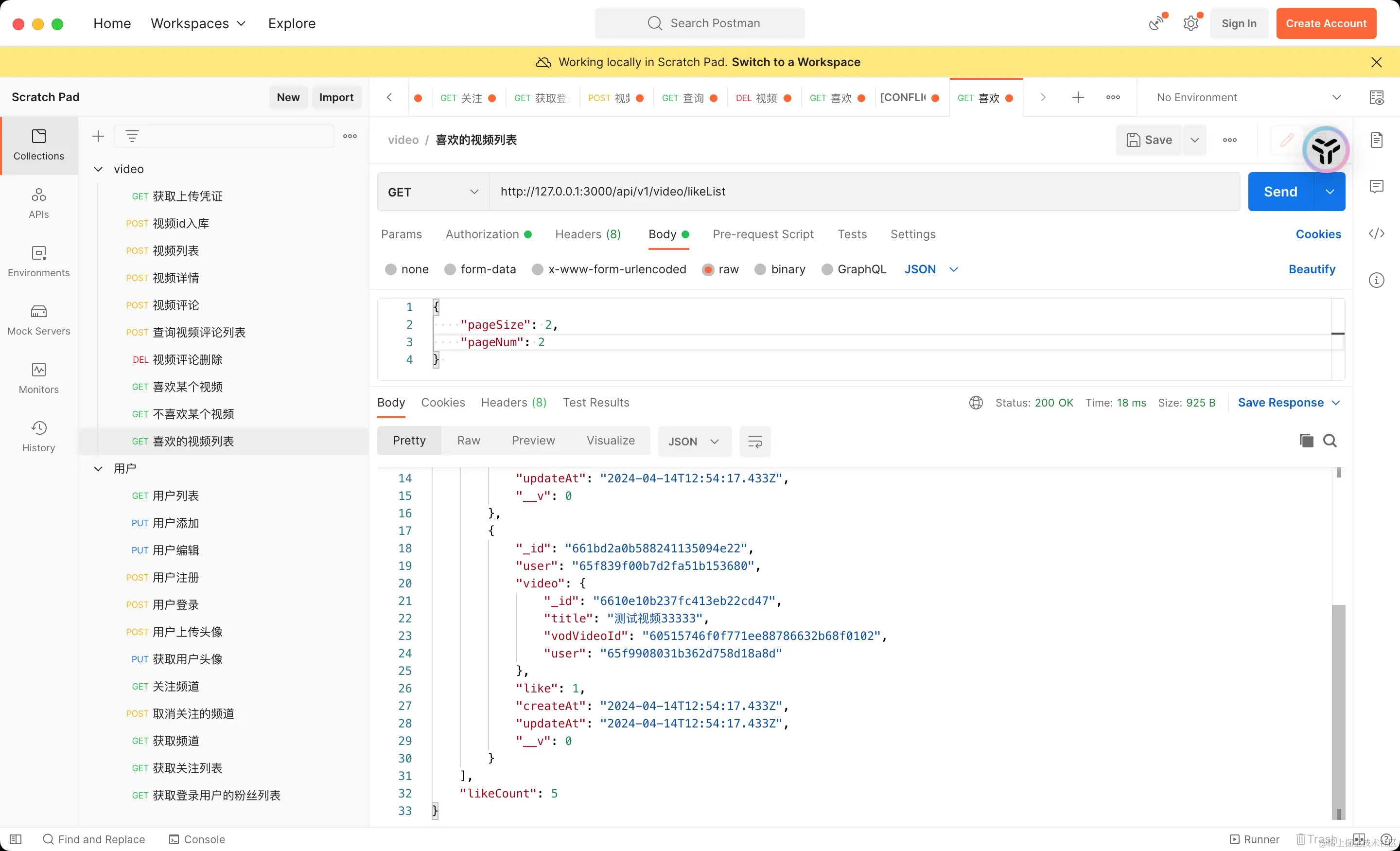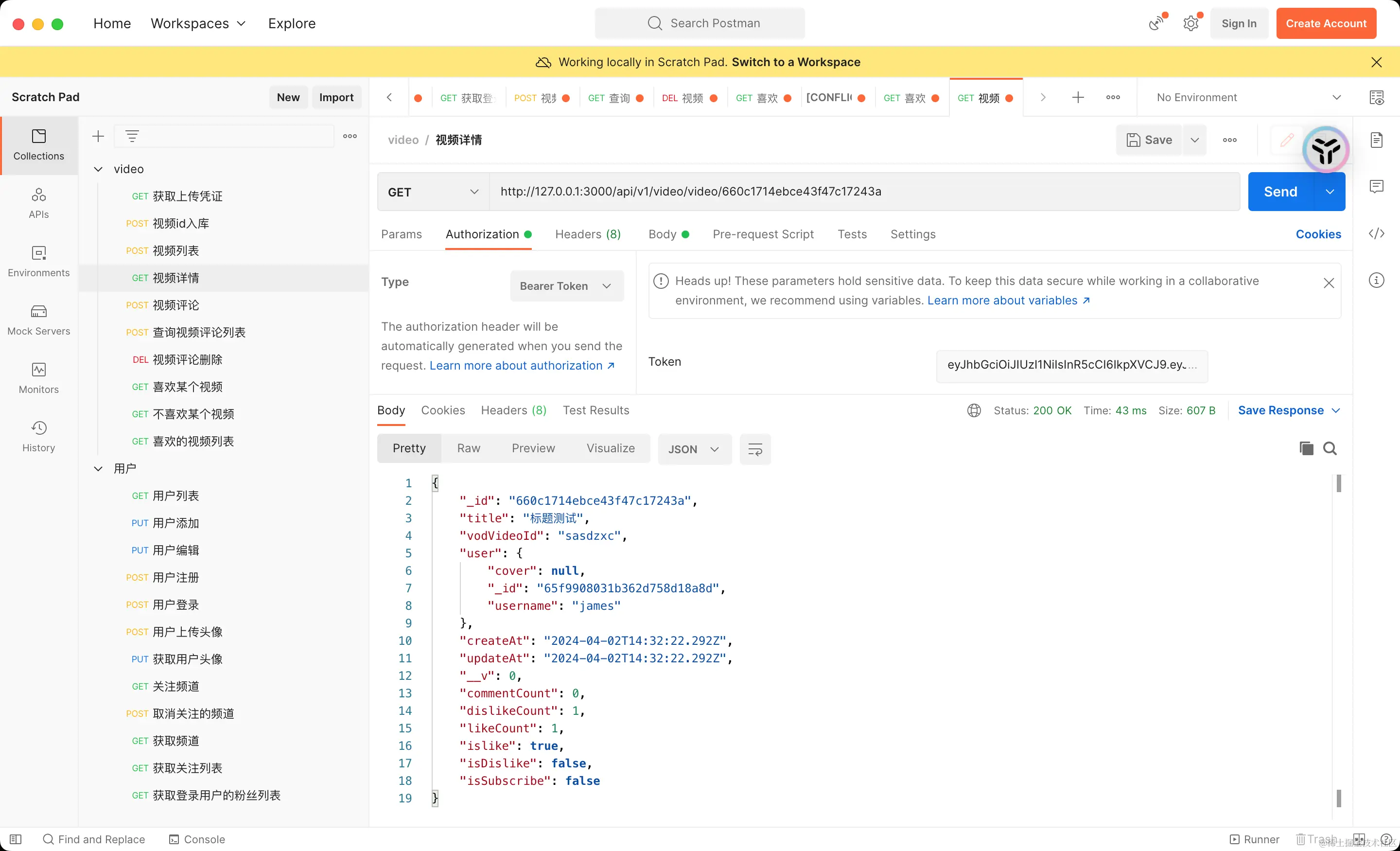 再次使用Postman来验证补全后的视频详情接口,确保各状态正确反映。