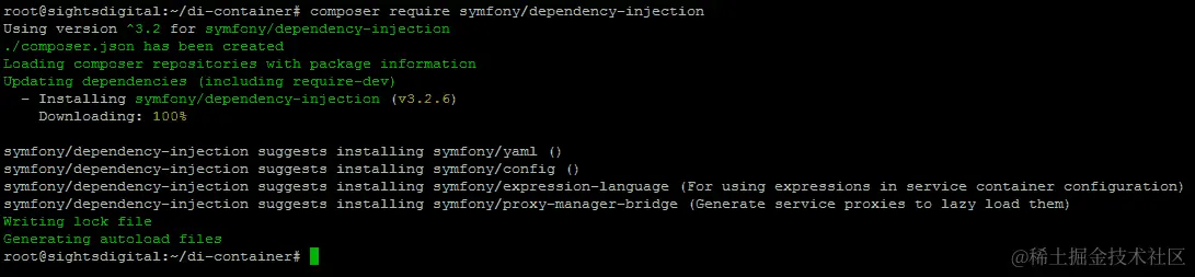 Symfony 框架提供的 DependencyInjection 组件是一个整洁的依赖注入容器,可以通过 Composer 轻松安装。