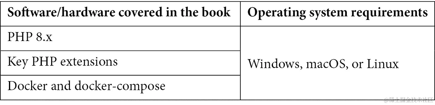 本书使用一个预构建的 Docker 镜像,其中包含创建和运行本书中涵盖的 PHP 8 代码示例所需的所有软件。您不需要在计算机上安装 PHP、Apache 或 MySQL:只需使用 Docker 和提供的镜像即可。