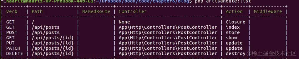 在这里,我们创建了另一个路由组,以便我们可以在其中添加api.auth中间件。还要注意的一点是,我们已经将一些帖子路由从帖子资源路由中拆分出来,以便在没有登录的情况下有一些可用的路由。我们也对评论路由做了同样的处理。
