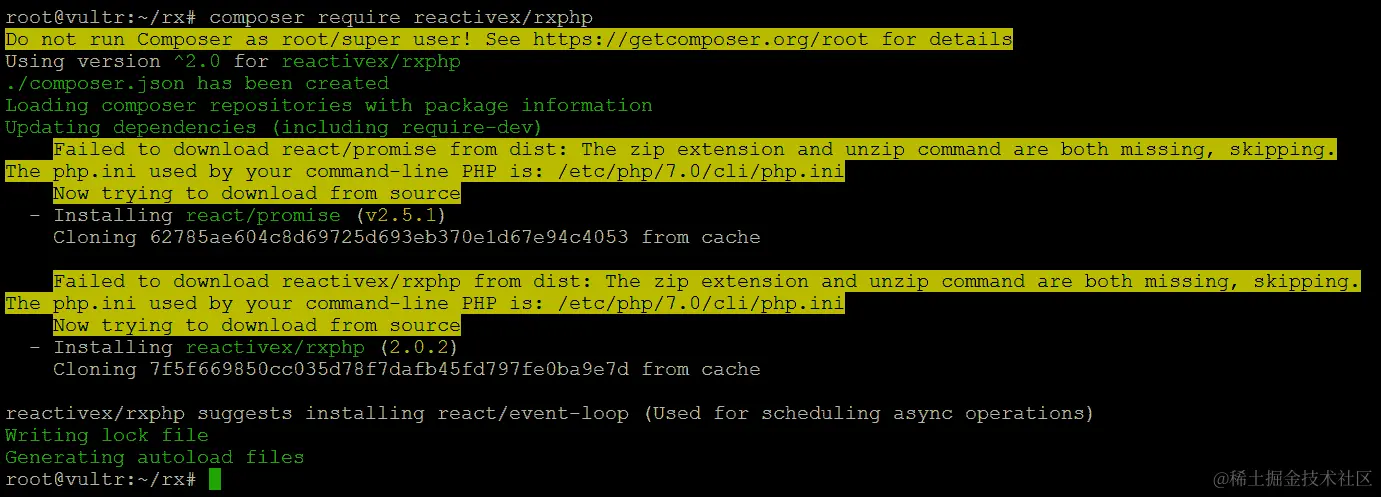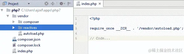React 库可作为 Composer react/react包获得。假设我们仍然在我们安装 RxPHP 的项目目录中,我们可以简单地执行以下命令来将 React 添加到我们的项目中: