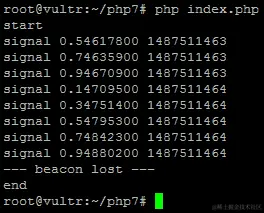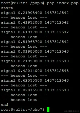使用$argv[1]表明该文件是用于从控制台运行。使用$argv[1],我们提供希望脚本运行的秒数。在循环内,我们有一个信号...输出,然后是短暂的0.2秒脚本休眠。