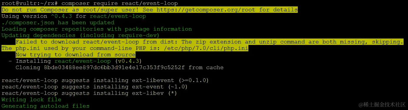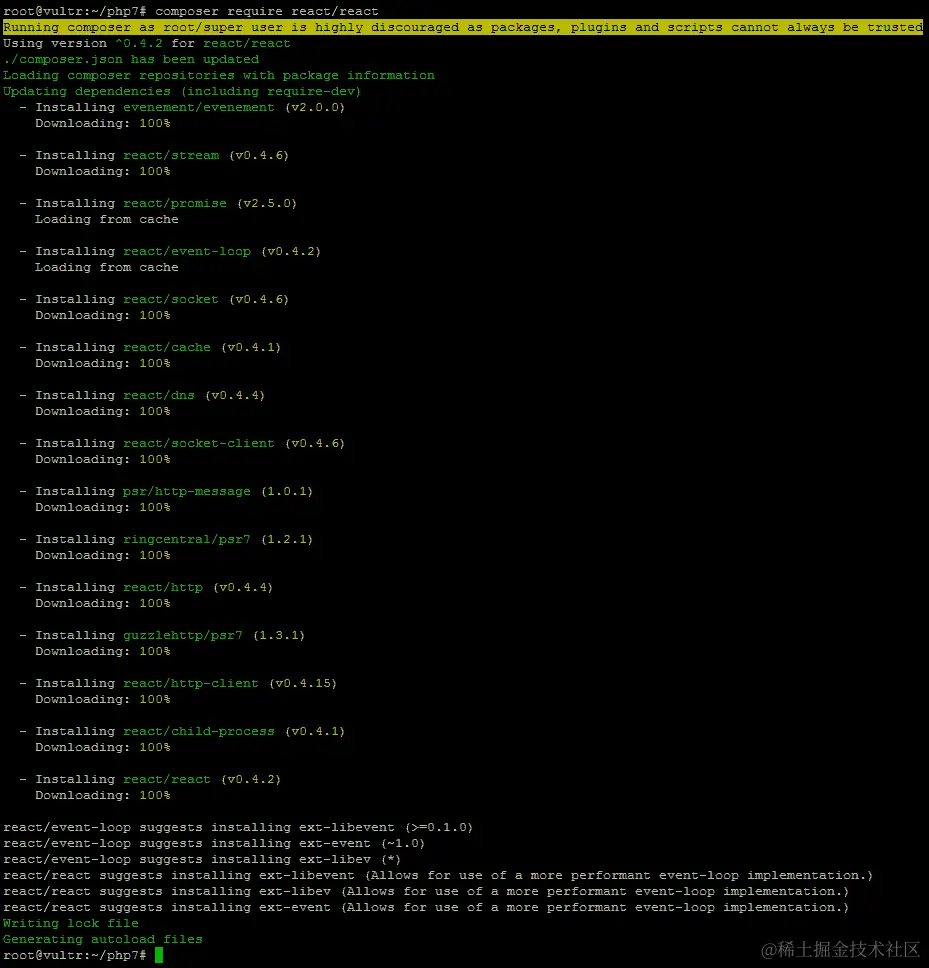 我们可以看到一些有趣的react/*包被引入,react/event-loop是其中之一。建议我们安装更高性能的循环实现的消息绝对值得关注,尽管超出了本书的范围。