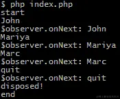当代码运行时,我们首先看到start字符串,然后我们输入John并按下,然后我们说$observer.onNext...,一直重复,直到我们输入quit。