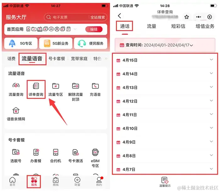 Step 2:在**【服务】中,点击【流量语音】,再选择【详单查询】**。