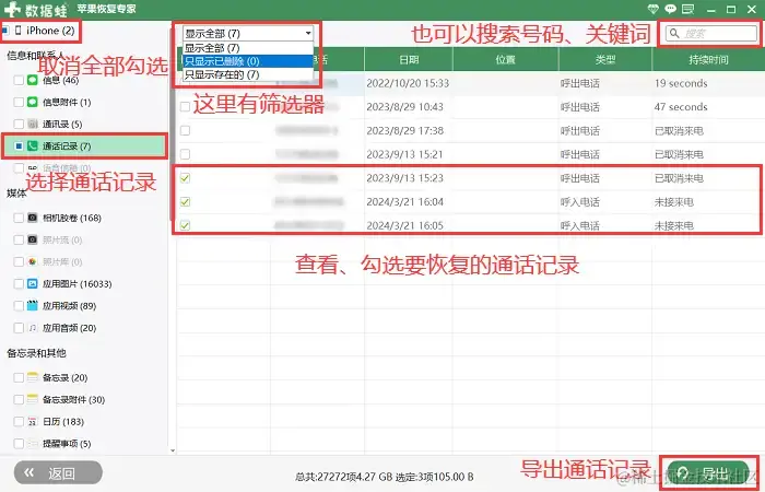 备注:如果你的通话记录比较多,我们可以通过【筛选器、搜索框】快速查找需要恢复的数据。