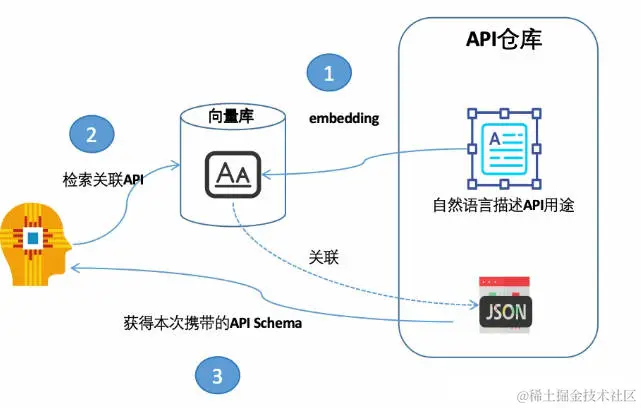 - 一种可能的解决方案是: 借助于向量数据库的语义搜索能力对所有的工具即 APIs 进行一次过滤,在每次需要 LLM 进行 text2API 的转换时,只携带与用户问题相关的 API Schema,这样可以大大减少输入的 tokens 与上下文大小。