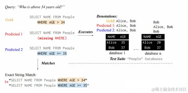 如果直接对比输出的 SQL:由于 Predicted2 和正确的 SQL 不完全一致,你可能判断它是错误的,但其实 Predicted2 的 SQL 在这个场景下是正确的。