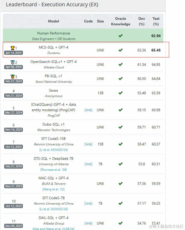 BIRD 是阿里达摩院联合香港大学一起推出的针对 text2SQL 的测试数据集。其作用与 Spider 类似,但是相对于 Spider 更专注于学术研究,BIRD 则更加考虑了真实应用中的数据库中信息的复杂性,且考虑了模型生成的 SQL 运行效率。BIRD 也包含了约 12000 多个自然语言与 SQL,涵盖了约 37 个专业领域的 90 多个数据库。与 Spider 类似,你也可以提交测试代码与模型给官方获得官方测试结果。最新排名如下: