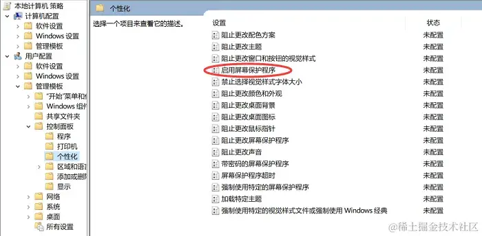 步骤2:在组策略编辑器中,依次展开 【用户配置】、【管理模板】、【控制面板】 、 【个性化】 ,然后找到【启用屏幕保护程序】 ;