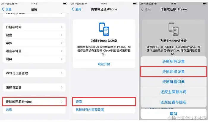 这个方法会重置关于网络的设置,但不会清空其他的数据。依次点击**【设置】>【通用】>【传输和还原】>【还原】>【还原网络设置】**。