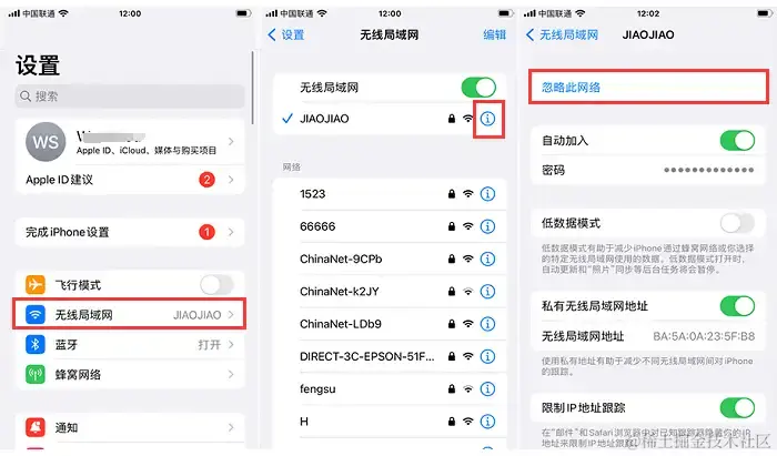 首先,确保你的无线网络设置正确。在手机的**【设置】应用中,点击【无线局域网】,找到你要连接的网络,在右侧的信息按钮旁边点击【忽略此网络】**,然后重新连接网络,输入密码尝试连接。