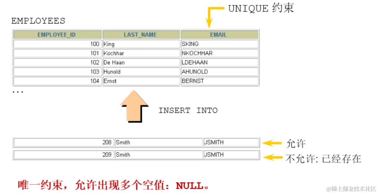 UNIQUE 唯一约束,规定某个字段在整个表中是唯一的