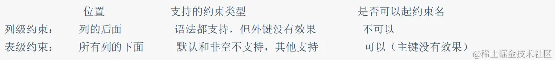 列级约束:只能作用在一个列上,跟在列的定义后面