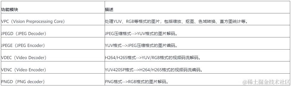 DVPP内的功能模块如下表所示。