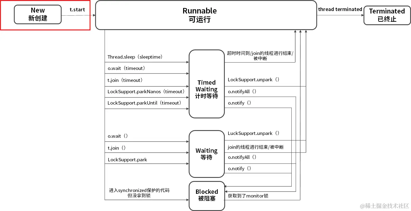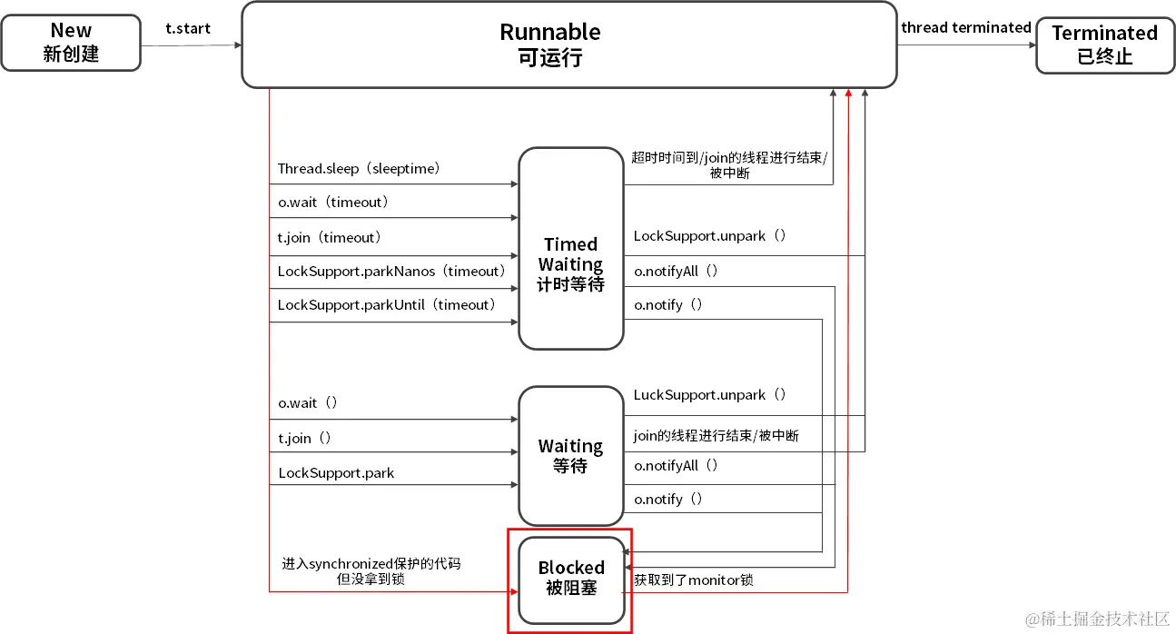 - 线程的状态是需要按照箭头方向来走的,比如线程从 New 状态是不可以直接进入 Blocked 状态的,它需要先经历 Runnable 状态。