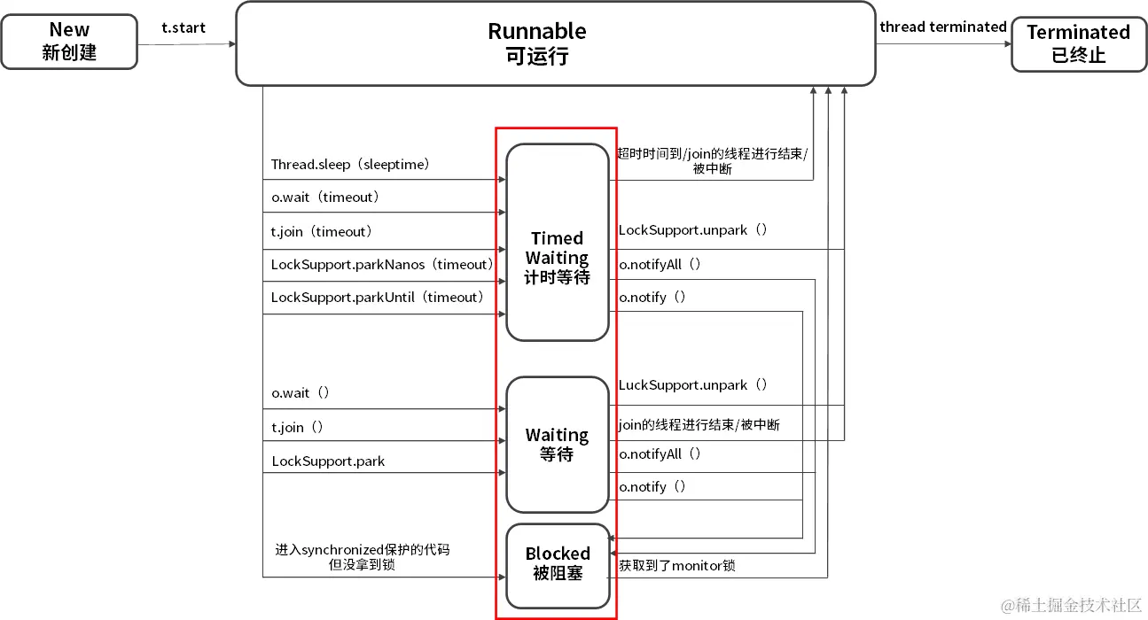 当然对于 Timed Waiting 而言,如果它的超时时间到了且能直接获取到锁/join的线程运行结束/被中断/调用了LockSupport.unpark(),会直接恢复到 Runnable 状态,而无需经历 Blocked 状态。