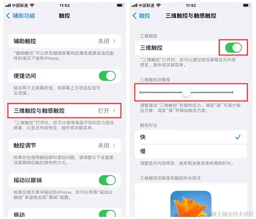 再次打开开关手机屏幕,设置的照片还是不会动,我们需要依次点击**【设置】-【通用】-【辅助功能】-【三维触控】。在打开的界面,打开【三维触控】**按钮,然后在灵敏度这里进行调整。