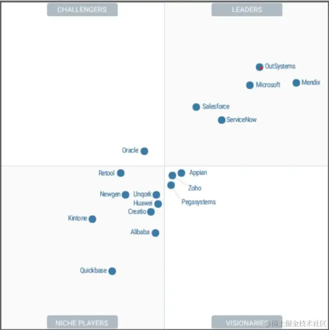 获取第三方信息也是评估低代码开发平台的重要途径之一。在市场宣传中,我们可能会找到许多正面评价,但找到一些消极负面的声音也同样重要。一些更大更成熟的平台可能会出现在第三方分析报告的测评中,如Gartner的魔力象限图、Forrester的Waves等等。