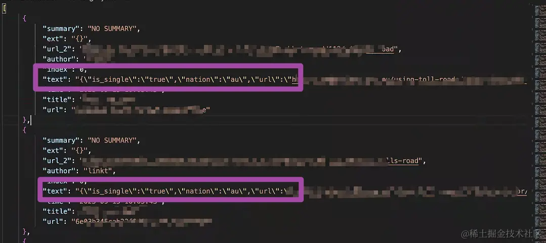 首先,我们来明确一下具体的需求。我们现有一个JSON文件数据,是一个包含多个JSON对象的列表,如下图所示;其中,我们希望将text中的内容提取出来——text中的数据都是以键值对的形式存储的,我们希望的是,将键值对的键作为.csv格式文件的列名,而值则是这一列对应的值;因为这个JSON数据中包含很多个text(每一个text中的所有键都是一样的,但是值不完全一致),所以我们最后就会得到一个具有很多行的.csv格式文件。