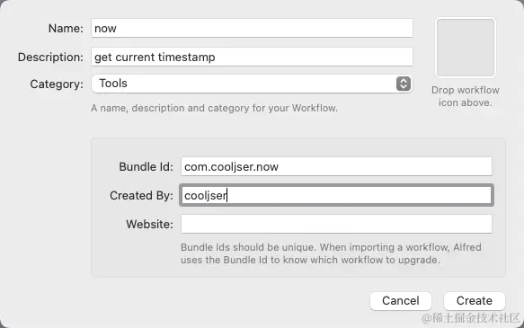 在弹出的表单中填写这个 workflow 相关的信息,包括:名称,描述,分类,bundle id,创建者等