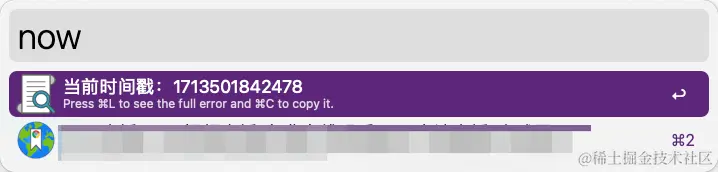 激动人性的时刻来了,我们打开 alfred,输入 now,就可以看到当前的时间戳了,按下回车就能直接将时间戳复制到剪切板了