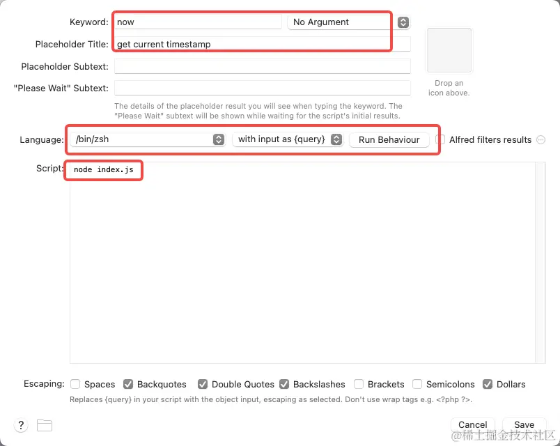 填写 script 的配置,language 配置 /bin/zsh 或者是 /bin/bash 都可以,Script的主体就是执行了一个名为index的 javascript文件,我们的实现代码也将会写在 index.js中