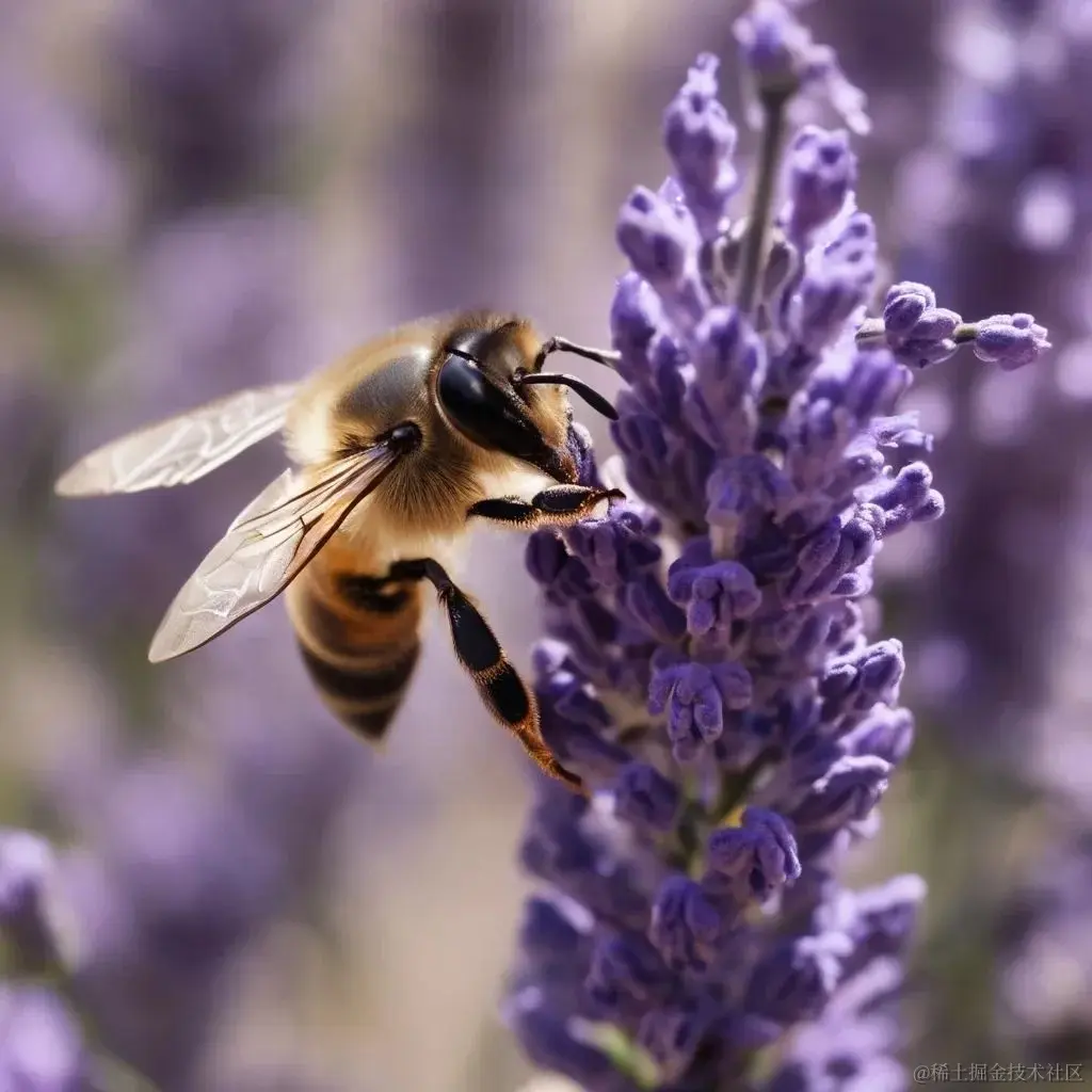 'prompt': 'macro shot of a bee collecting nectar from lavender flowers',
