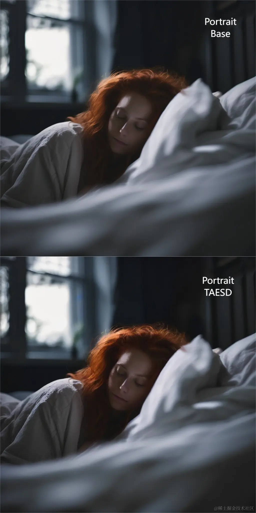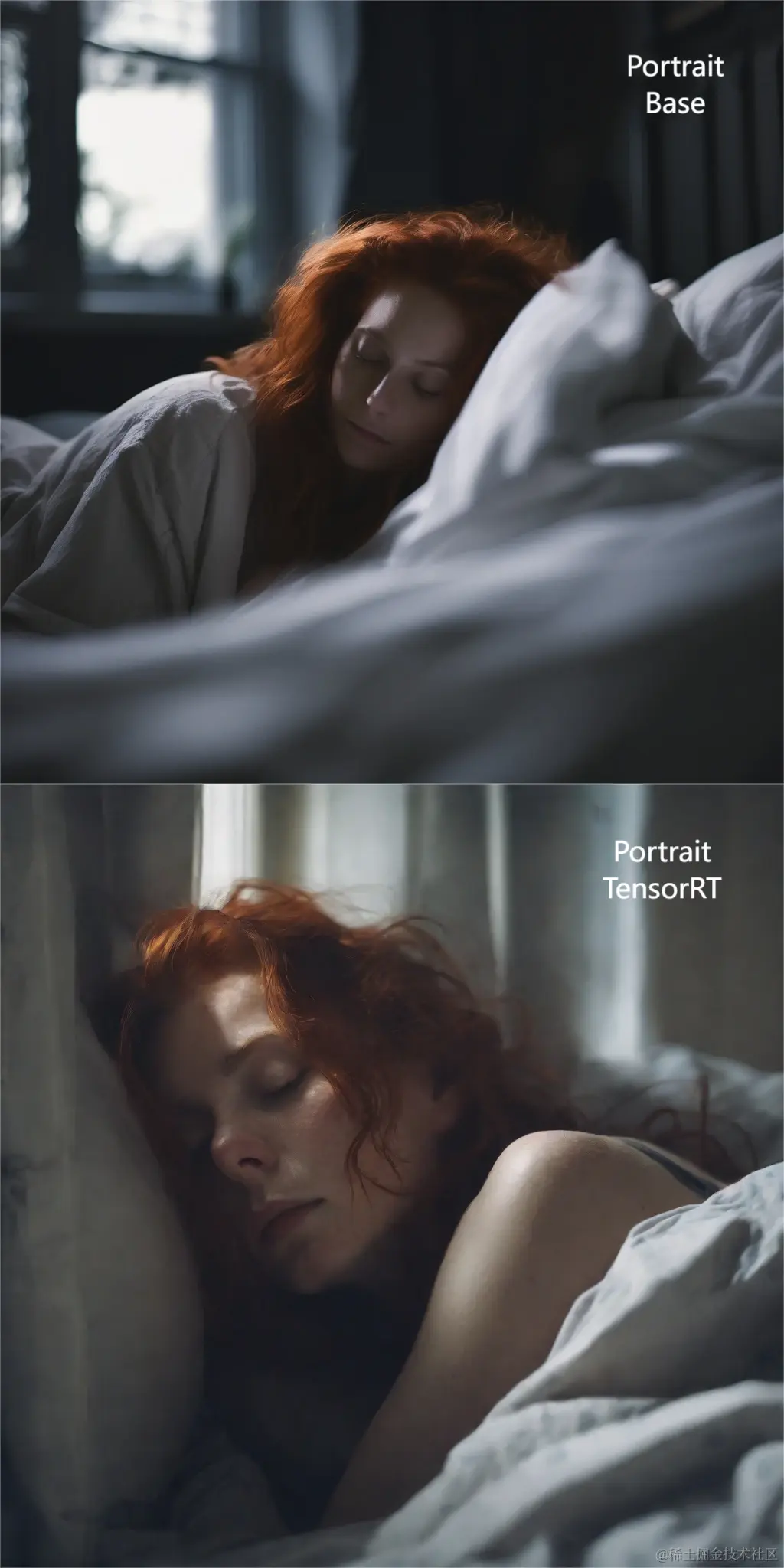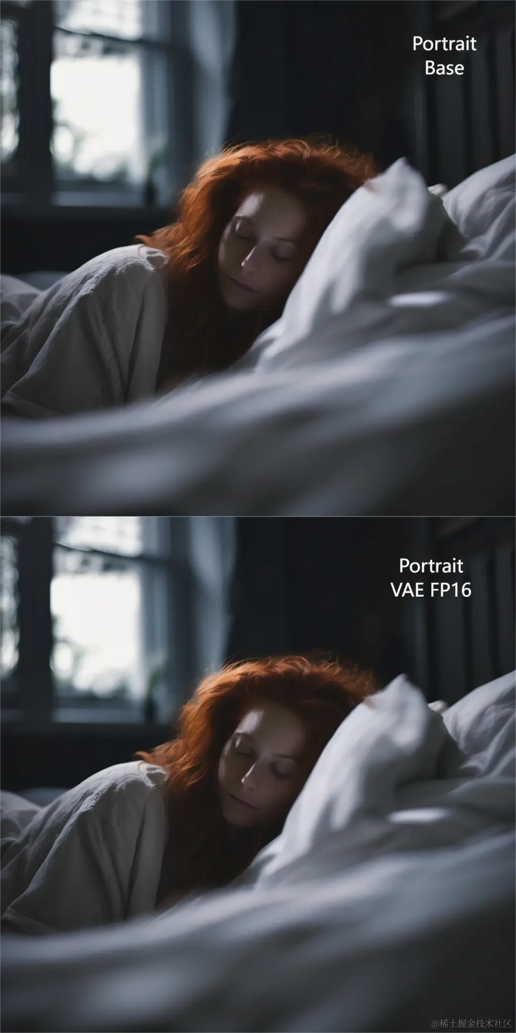 'prompt': '3/4 shot, candid photograph of a beautiful 30 year old redhead woman with messy dark hair, peacefully sleeping in her bed, night, dark, light from window, dark shadows, masterpiece, uhd, moody',
