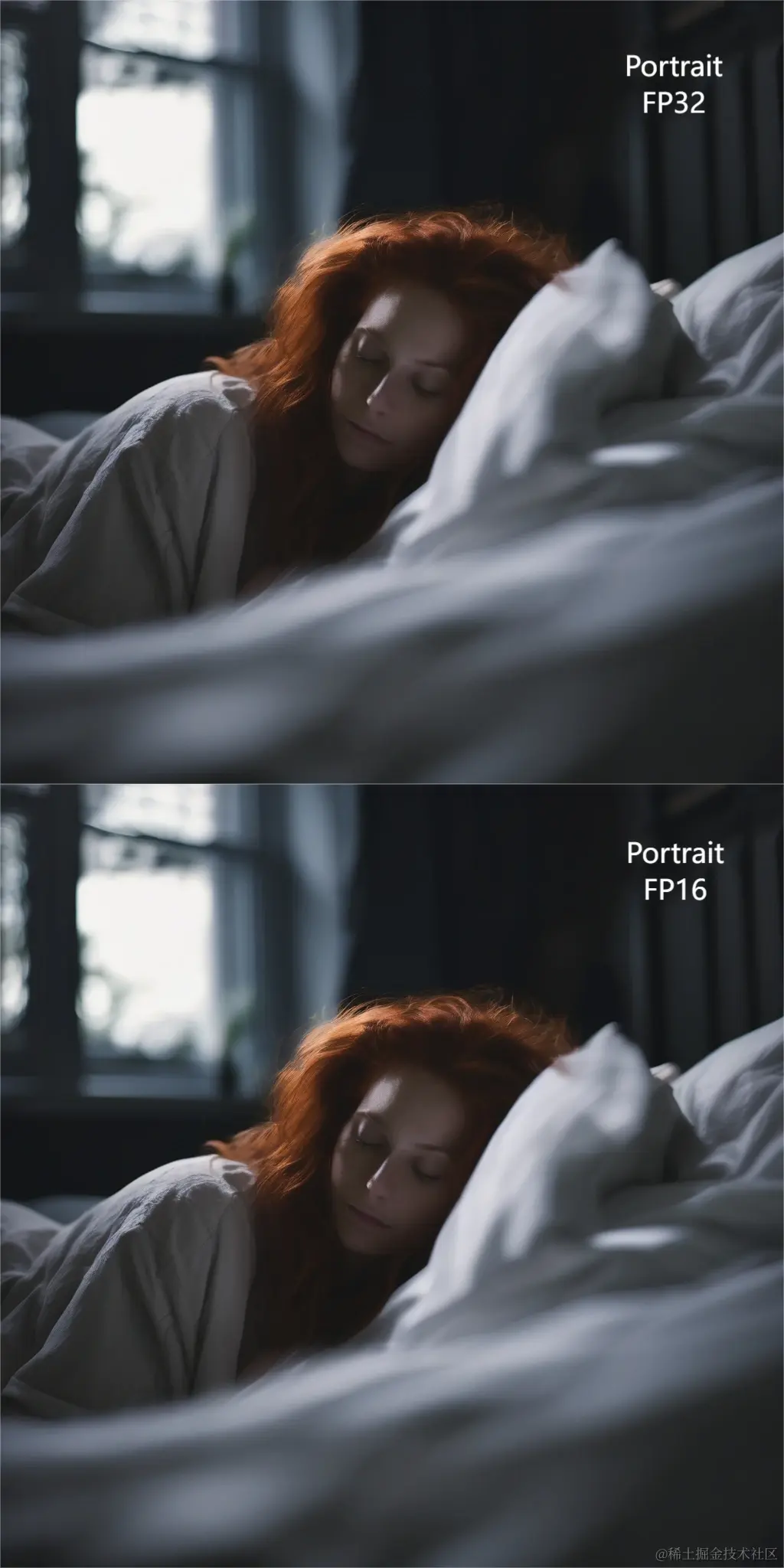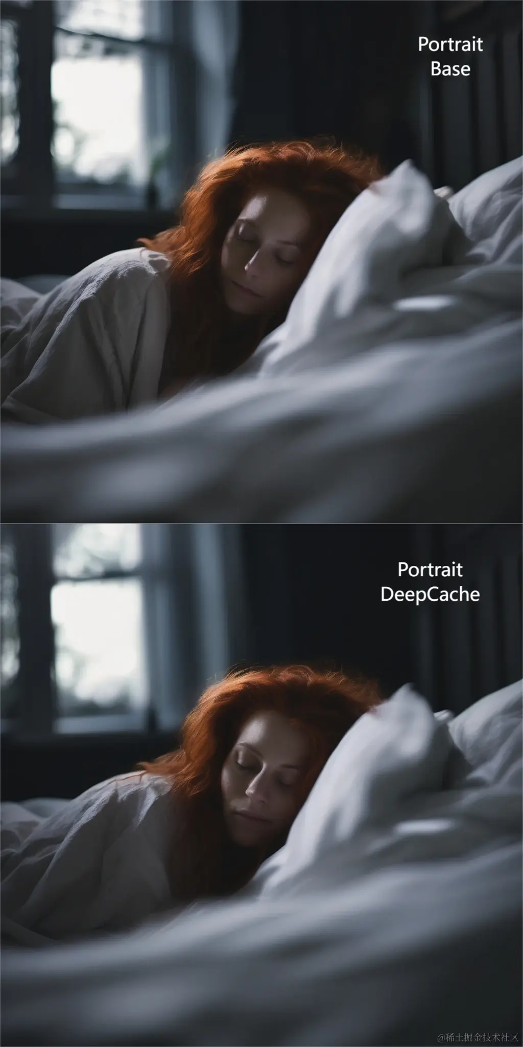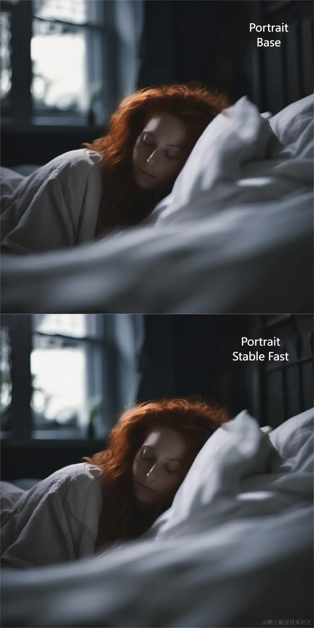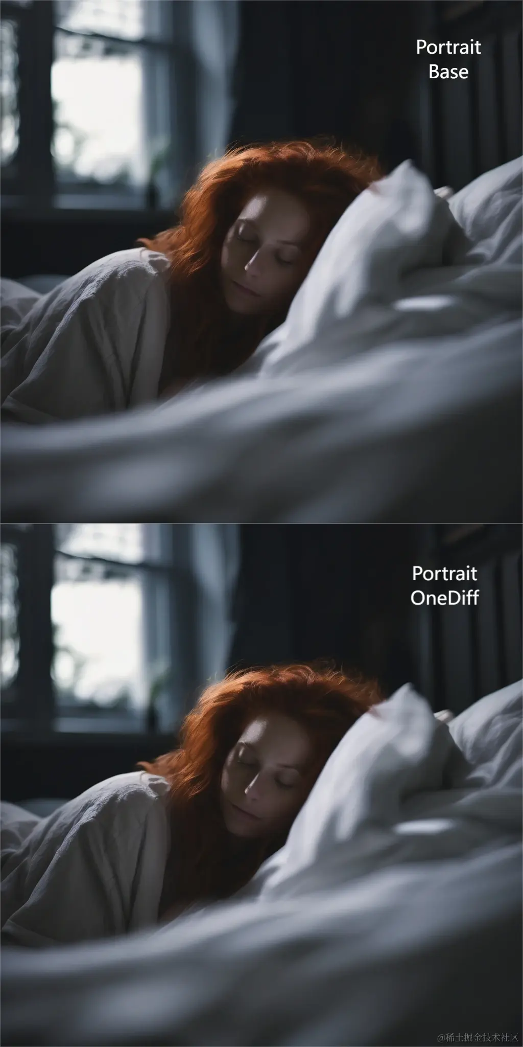 'prompt': '3/4 shot, candid photograph of a beautiful 30 year old redhead woman with messy dark hair, peacefully sleeping in her bed, night, dark, light from window, dark shadows, masterpiece, uhd, moody',