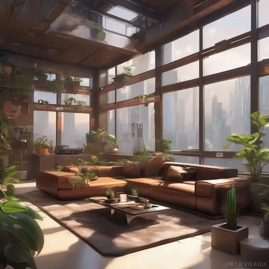 'prompt': 'futuristic living room with big windows, brown sofas, coffee table, plants, cyberpunk city, concept art, earthy colors',