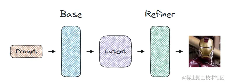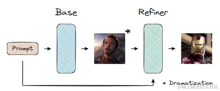 在Stable Diffusion XL中,经典的图像到图像(img2img)方法并不新鲜。这种方法是使用基础模型生成完整图像,然后将生成的图像和原始提示一起传递给细化模型,细化模型使用这些条件生成新的图像。