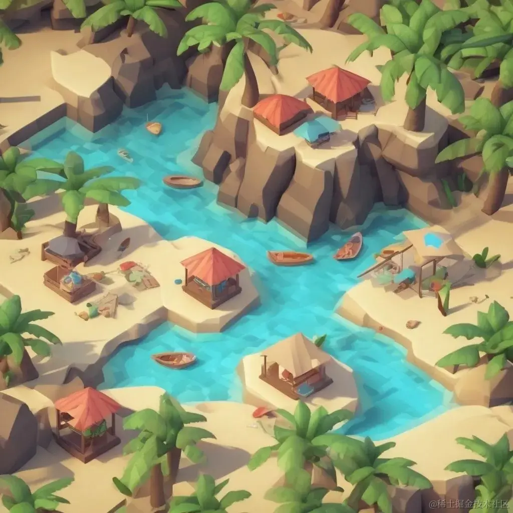 'prompt': '3d rendered isometric fiji island beach, 3d tile, polygon, cartoony, mobile game',