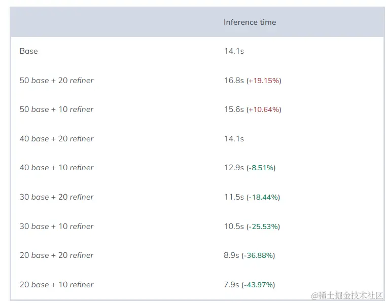 另一方面,如果我们在基础模型中使用较少的步数,结果会稍微好一些。这是因为使用如此少的步数,基础模型无法添加细微的细节,为细化模型提供了更大的发挥空间。
