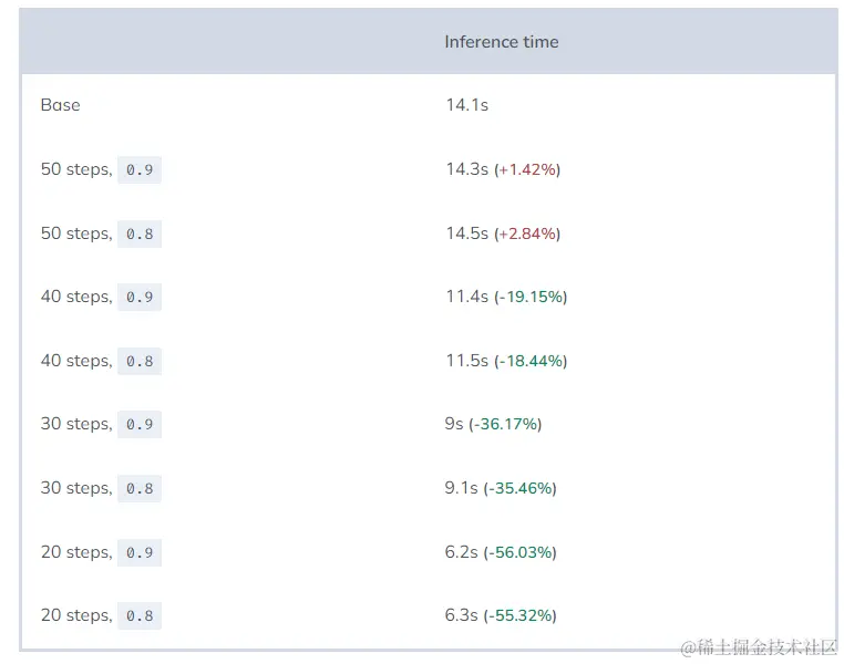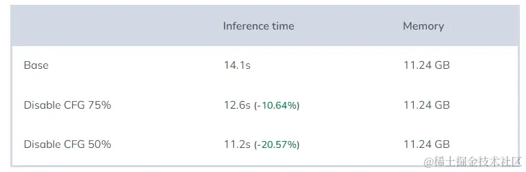 正如我们所预期的,在50%的情况下停用CFG,可以使每张图像的推理时间减少25%(并非总体时间,因为模型加载时间也计入其中)。这是因为如果使用CFG执行50步操作,模型实际上清理了100个张量。而使用这种优化方法,模型在前25步清理了50个张量,在接下来的25步中清理了一半(25个张量)。所以,75/100相当于跳过了25%的工作量。在停用CFG达到75%的情况下,每张图像的推理时间减少12.5%。