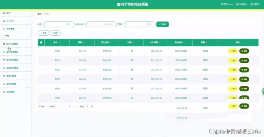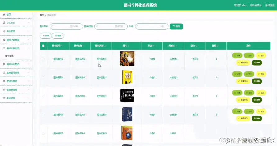 图书个性化推荐系统的主要使用者分为管理员和学生,实现功能包括管理员:首页、个人中心、学生管理、图书分类管理、图书信息管理、图书预约管理、退换图书管理、管理员管理、留言板管理、系统管理,学生:首页、个人中心、图书预约管理、退换图书管理、我的收藏管理,前台首页;首页、图书信息、好书推荐、留言反馈、个人中心、后台管理等功能。