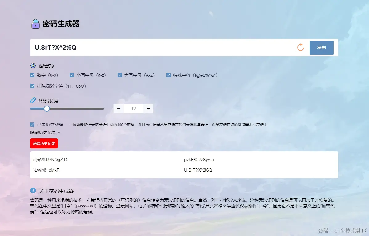 >---该功能将记录您最近生成的100个密码。并且历史记录不是存储在我们云端服务器上,而是存储在您的浏览器本地存储中。</span