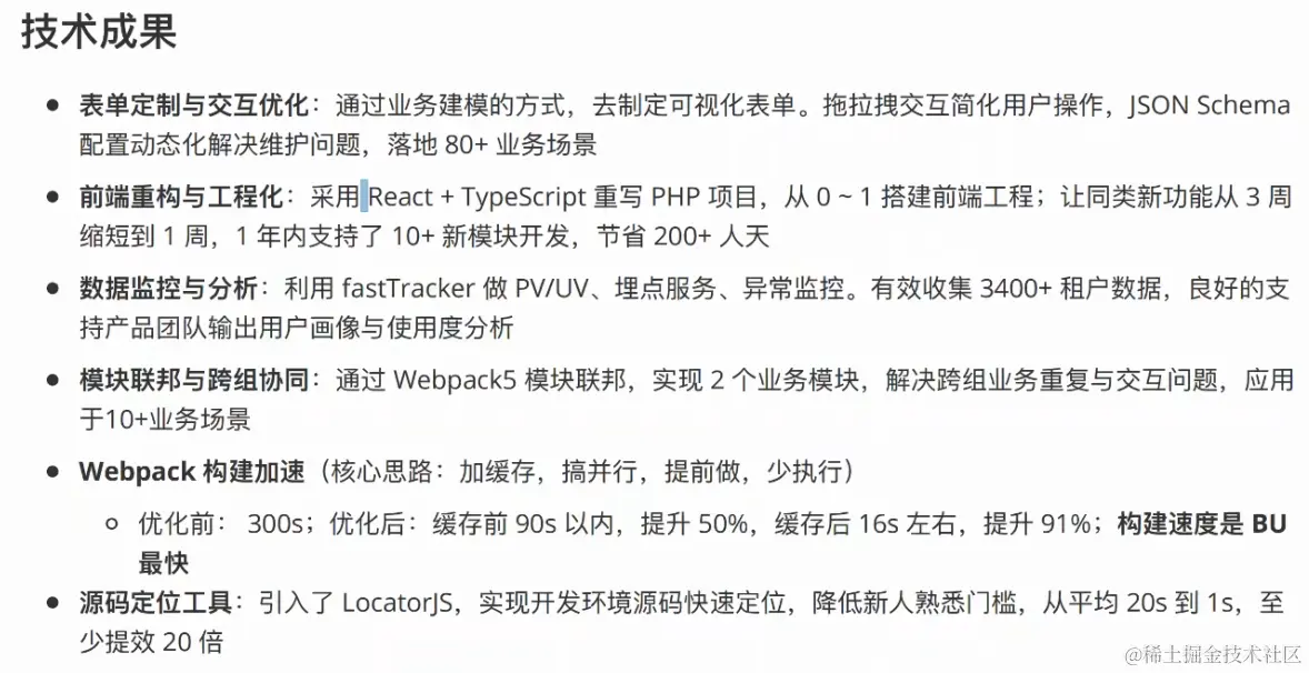 技术架构类:搭建了 CI/CD 自动化部署系统,搭建了页面数据采集、监控系统,微应用、低代码、前端基建等