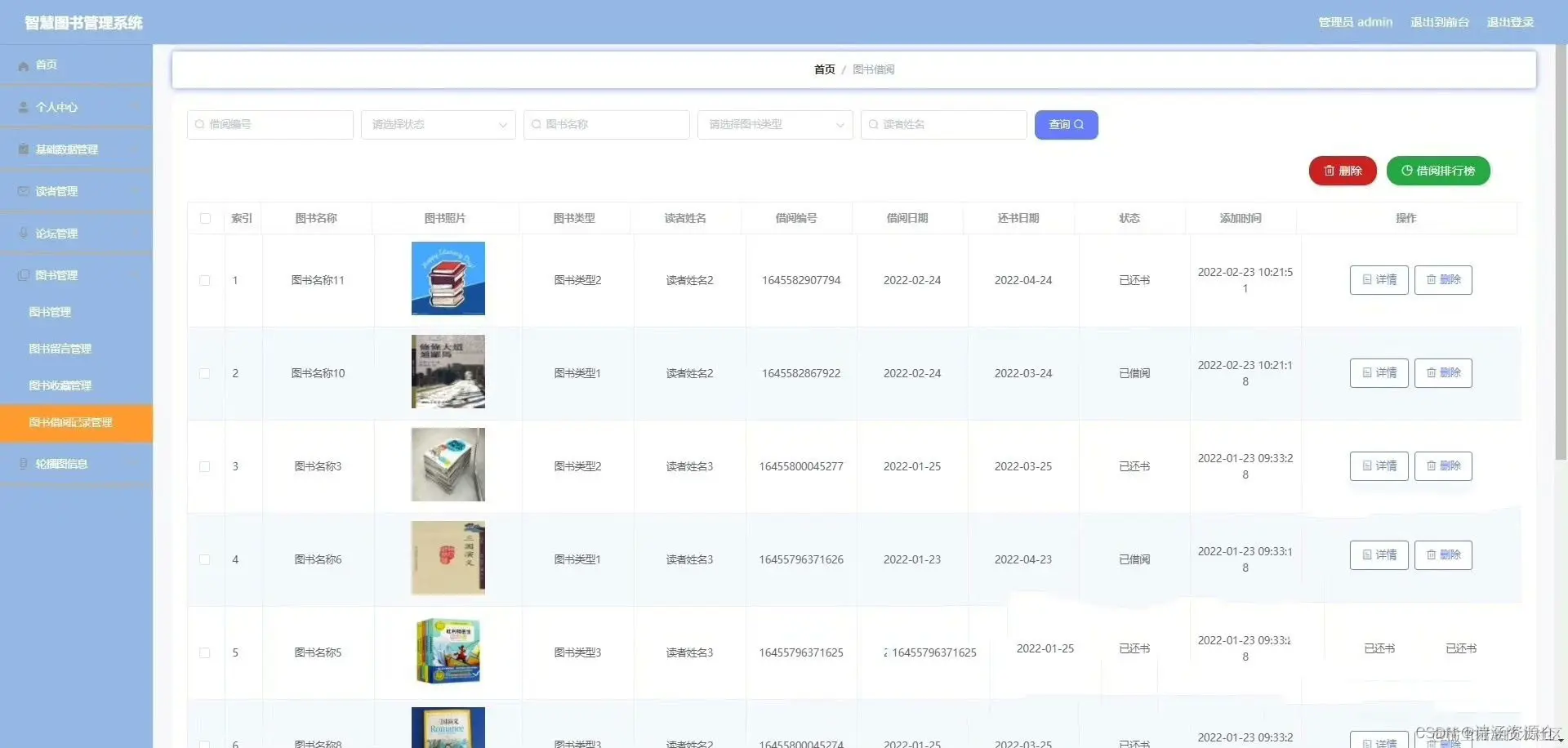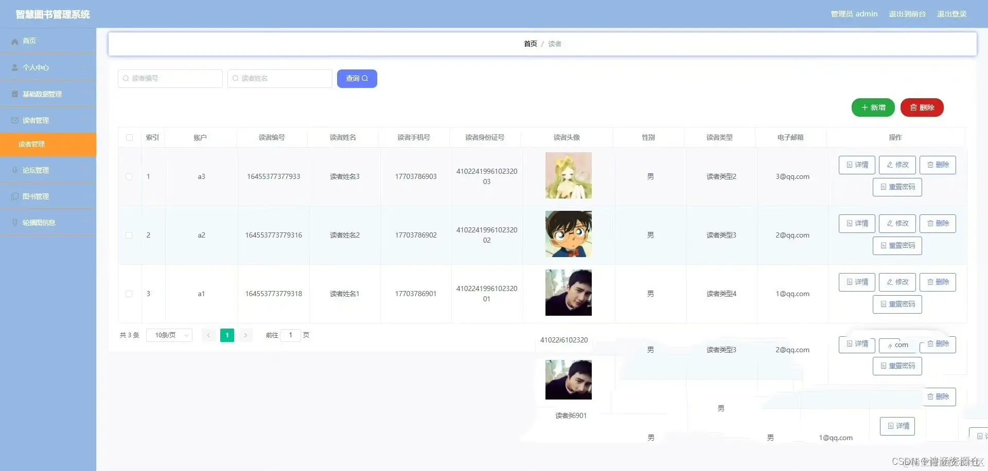 管理员权限操作的功能包括对注册读者信息的管理,对图书,对图书留言,对图书借阅记录,对论坛帖子等信息的管理。 读者权限操作的功能包括借阅图书,对图书进行留言或收藏图书,查看论坛帖子信息,查看借阅的图书等