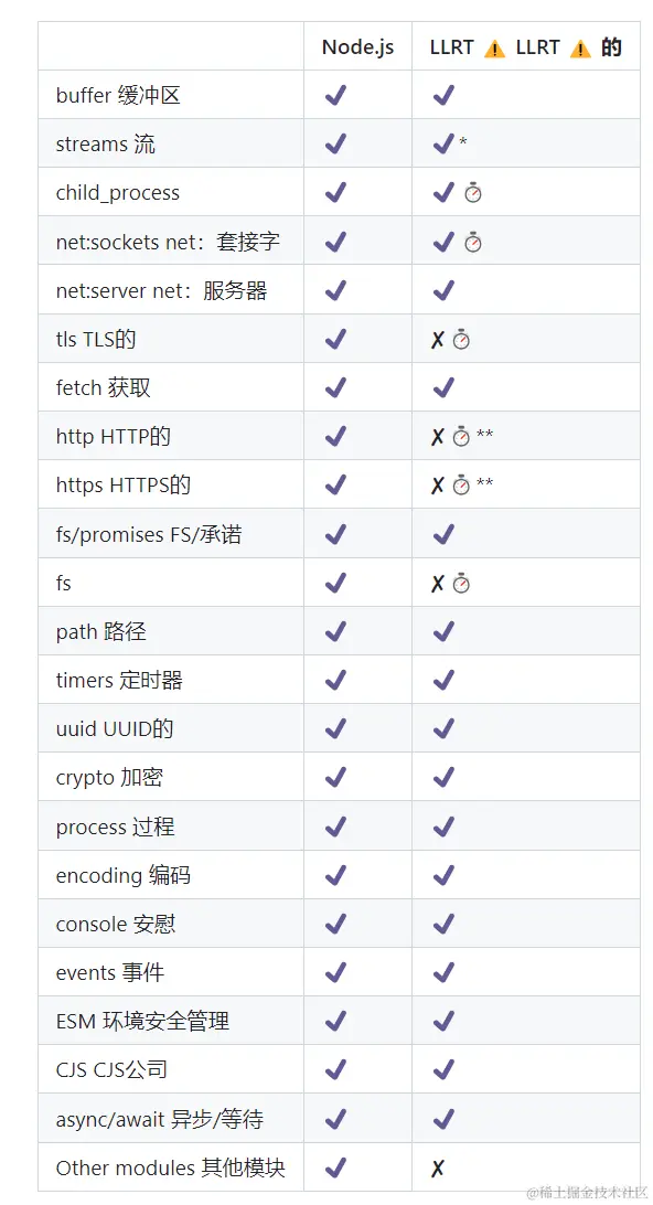 LLRT 仅支持一小部分 Node.js API。它不是Node.js的替代品,也永远不会是。下面是部分支持的 API 和模块的高级概述。有关更多详细信息,请参阅 API 文档